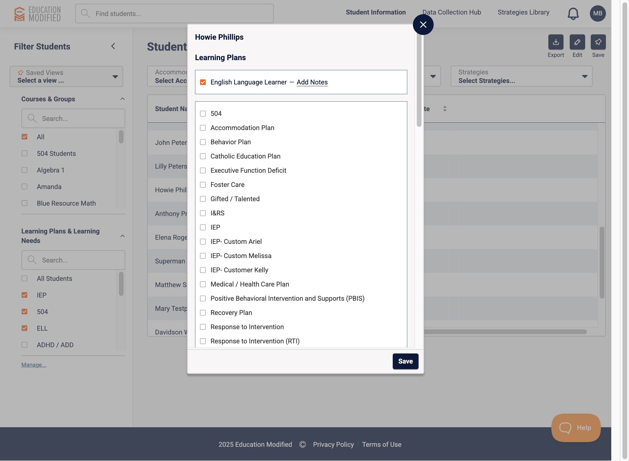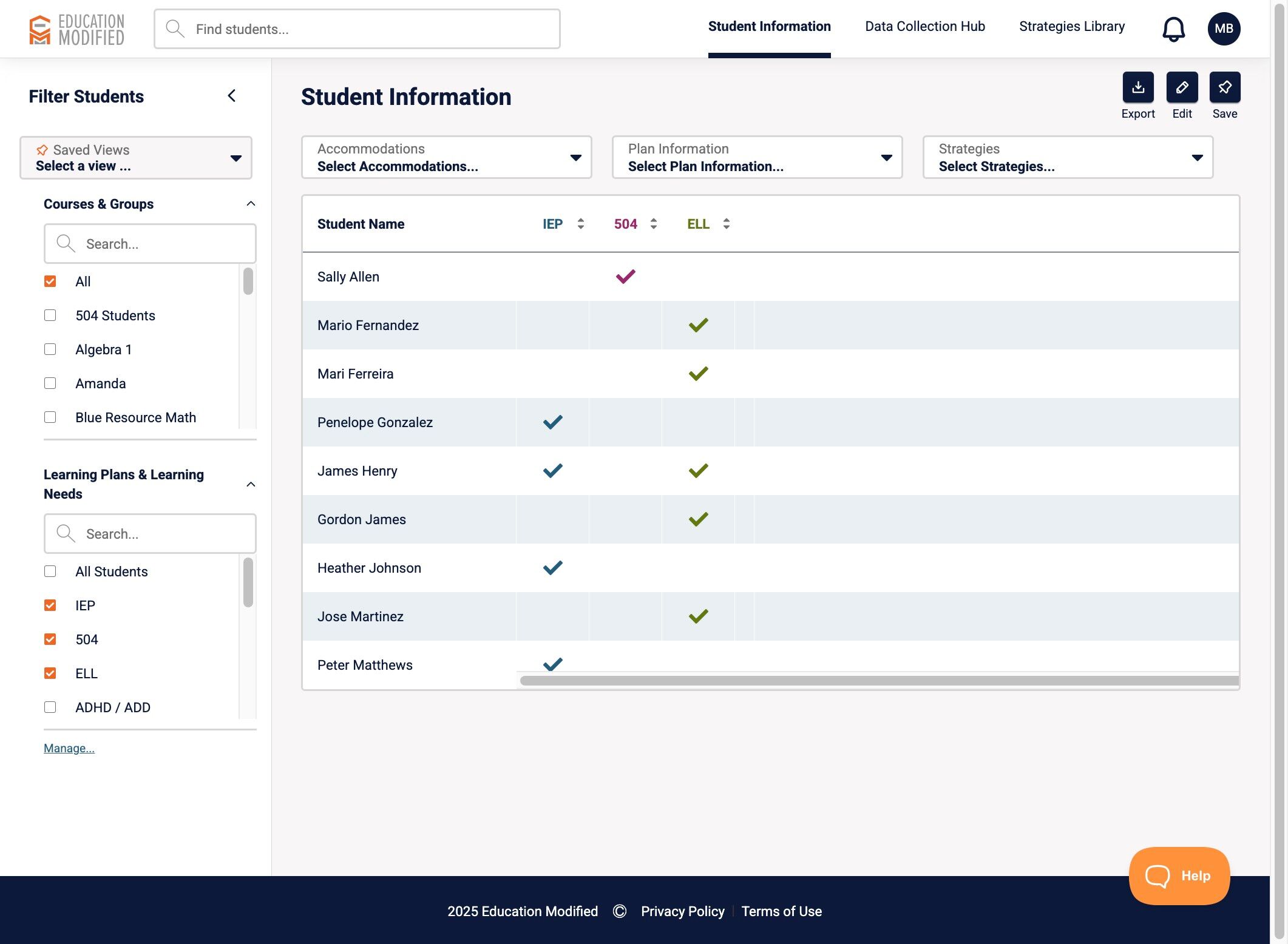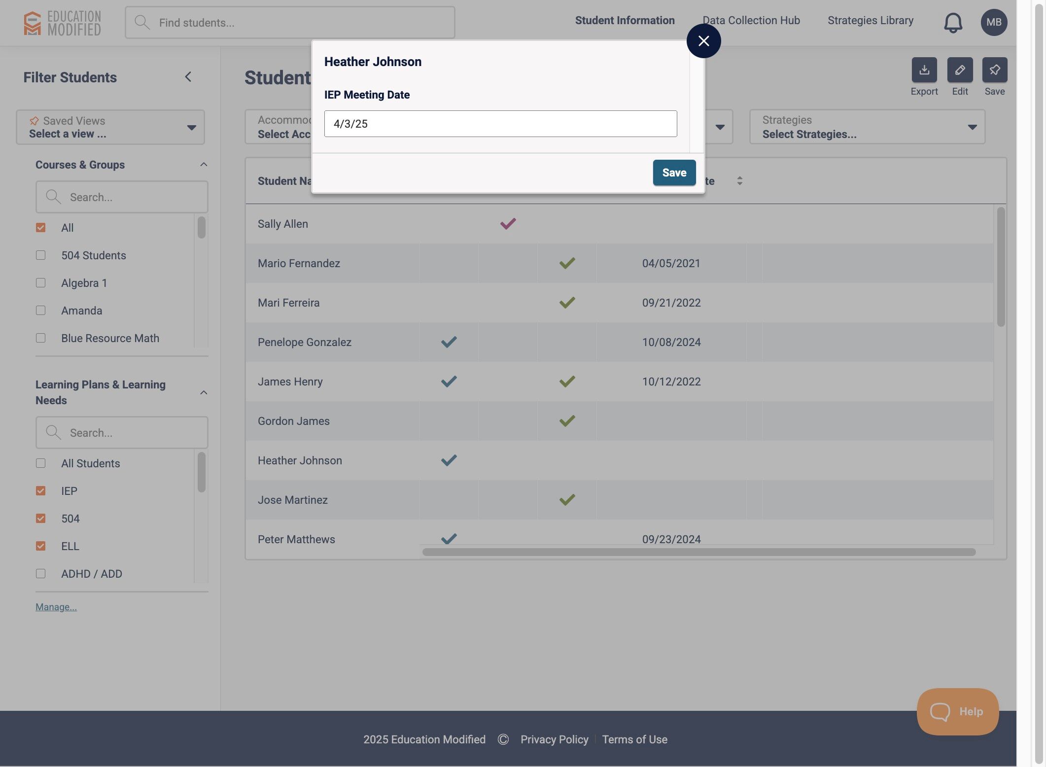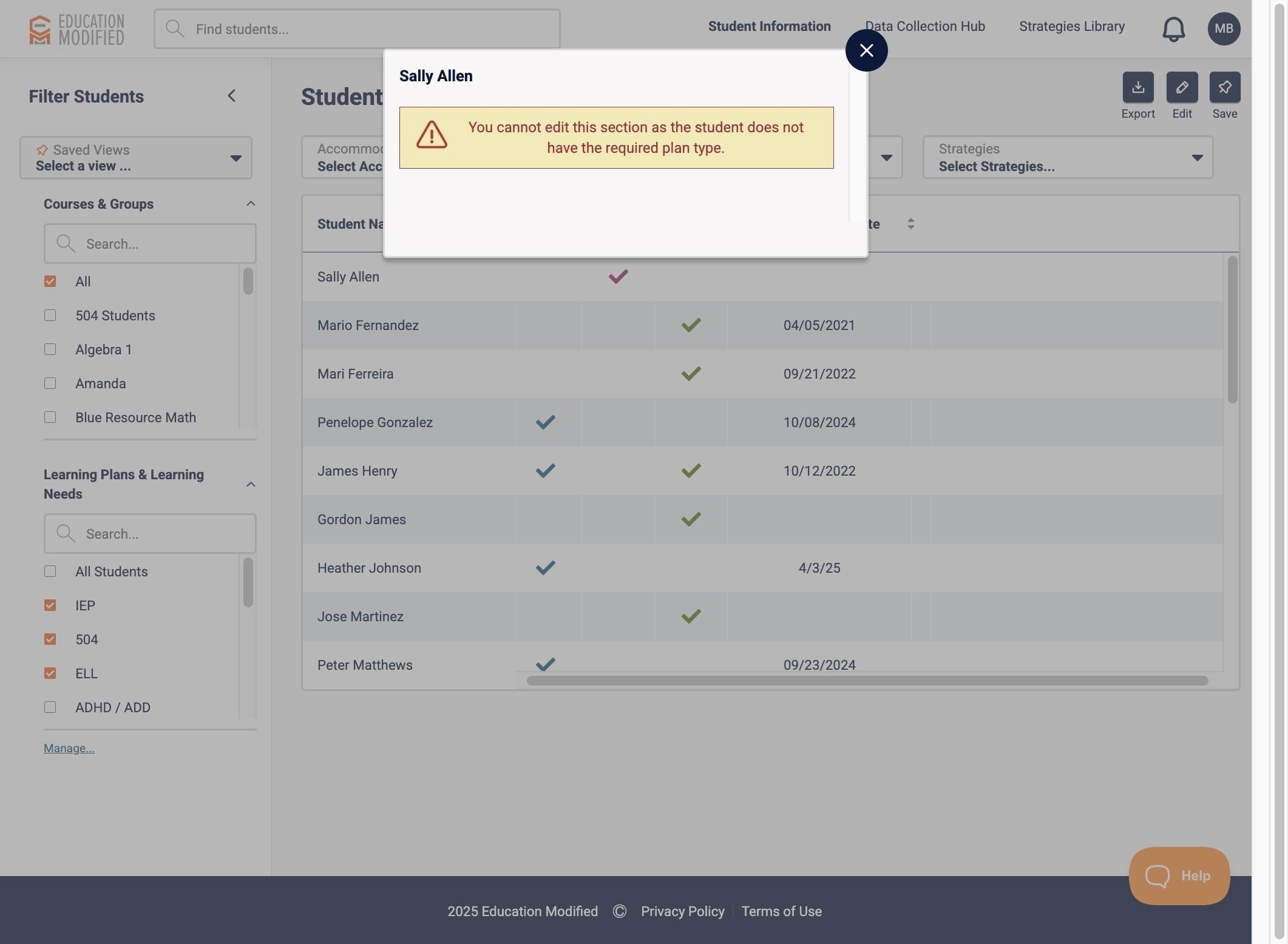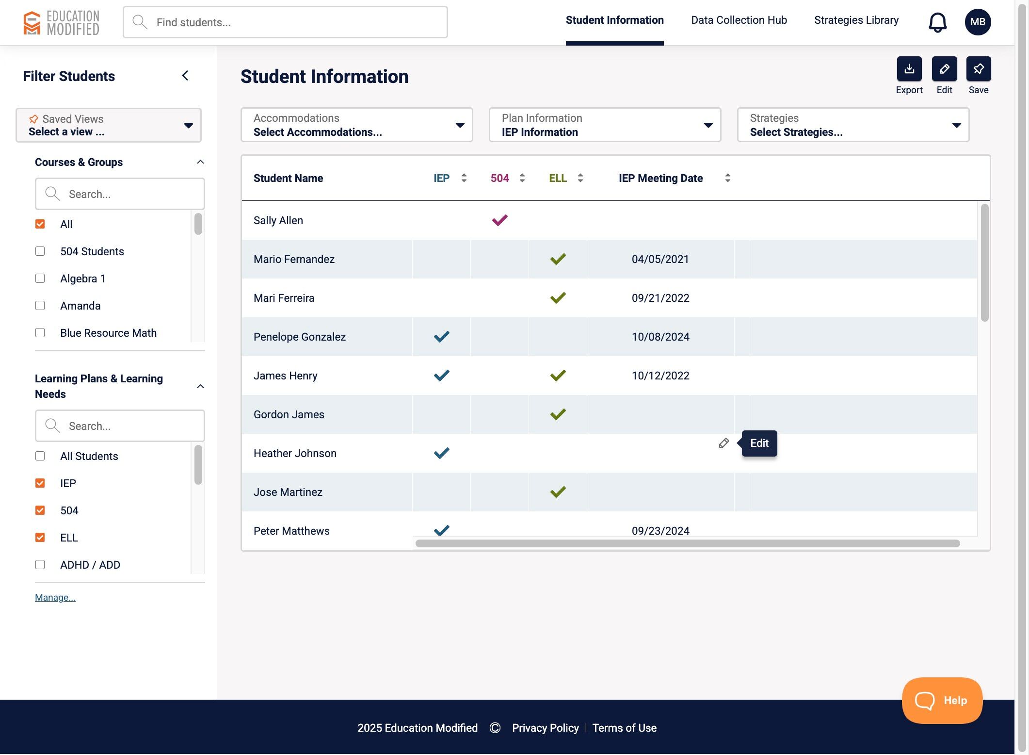 Tip: Editing in the Filter View is available for: Learning Plans & Learning Needs, Accommodations, Plan Information, and Strategies filters.
