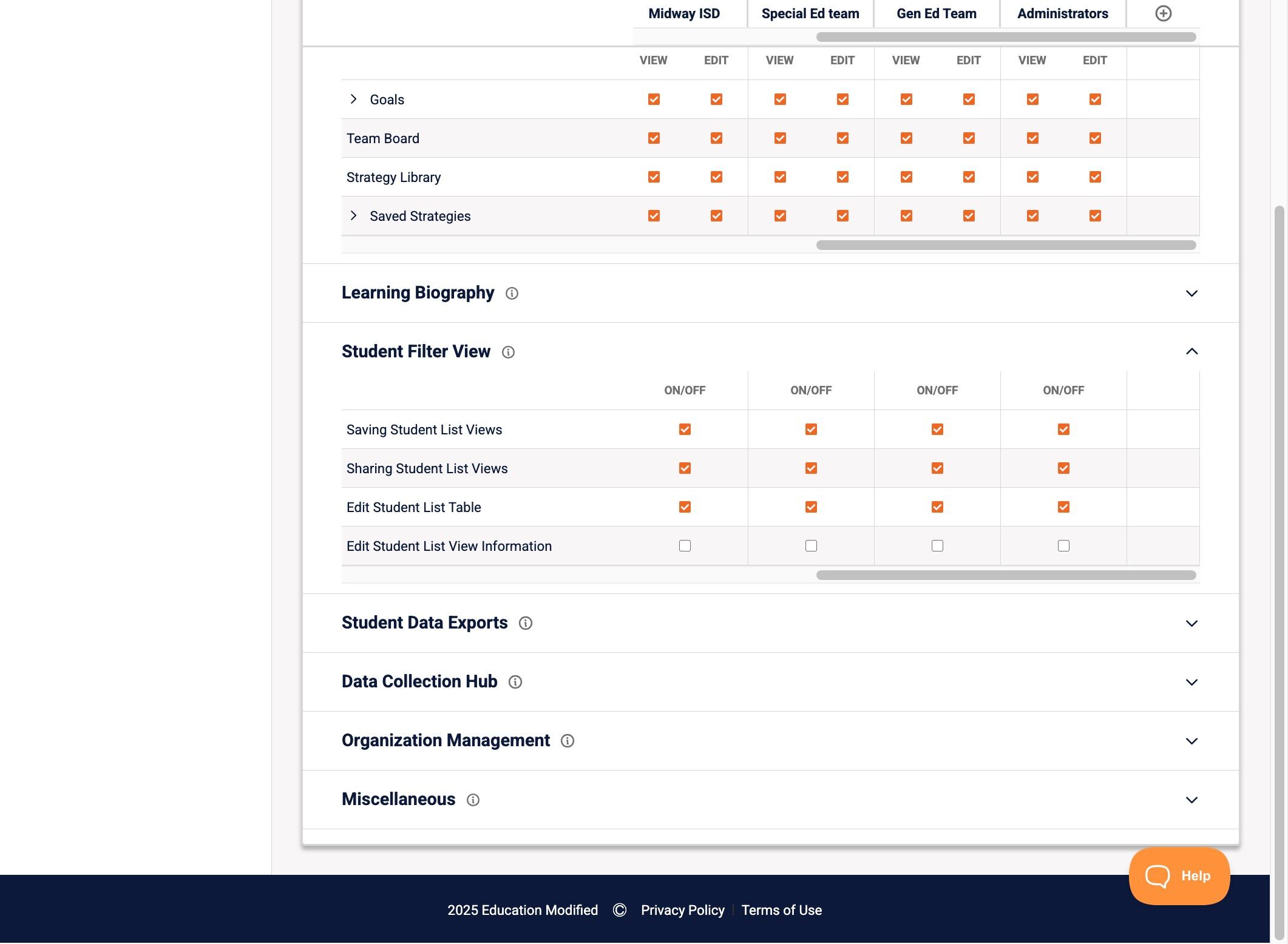 5. This new feature is called "Edit Student List View Information". Check the box in the column of the groups you would like to have access to this feature.