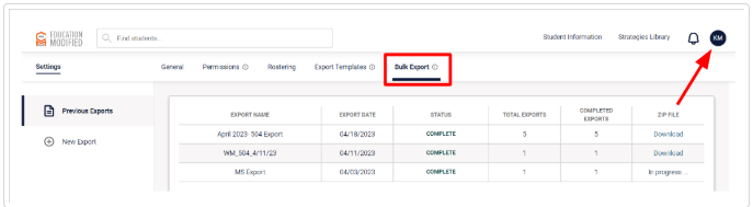 - Navigate to Settings and then the Bulk Export feature in Education Modified.